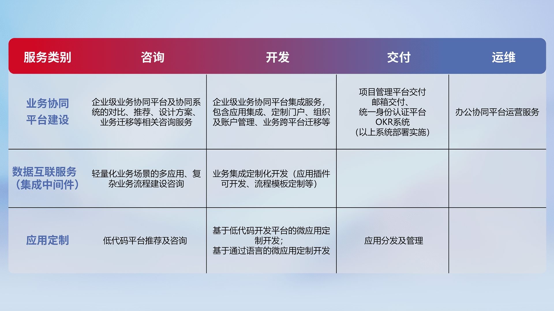针对钉钉、、、企微、、、、IDaas等平台级产品提供产品的规划、、方案、、、交付、、、、定制化开发等服务,,,实现如统一协同办公、、、、智能客户服务、、混合会议管理、、智能数据查询、、等业务场景,,,实现数字化转型。。。。