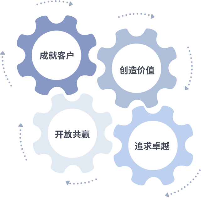 成就客户是一切决策的出发点,,创造价值是衡量所有工作的标准,,,追求卓越是我们做事做人的态度,,,,开放共赢是我们的格局也是最终的结果。。价值观的齿轮环环相扣,,,,推动着组织里的每个人不断向前。。。